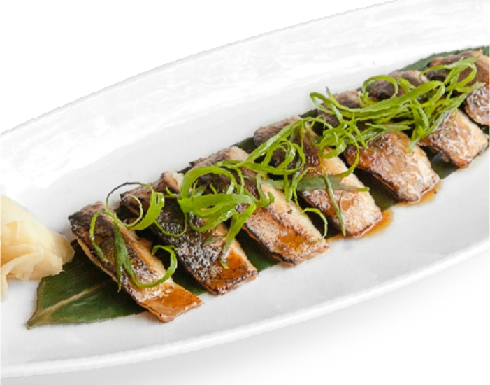 опаленная макрель, маринованная в соусе на основе саке и имбиря