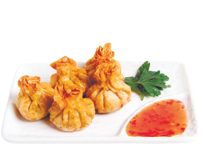 жареные пельмени с креветками, курицей, имбирем и соусом Свит Чили